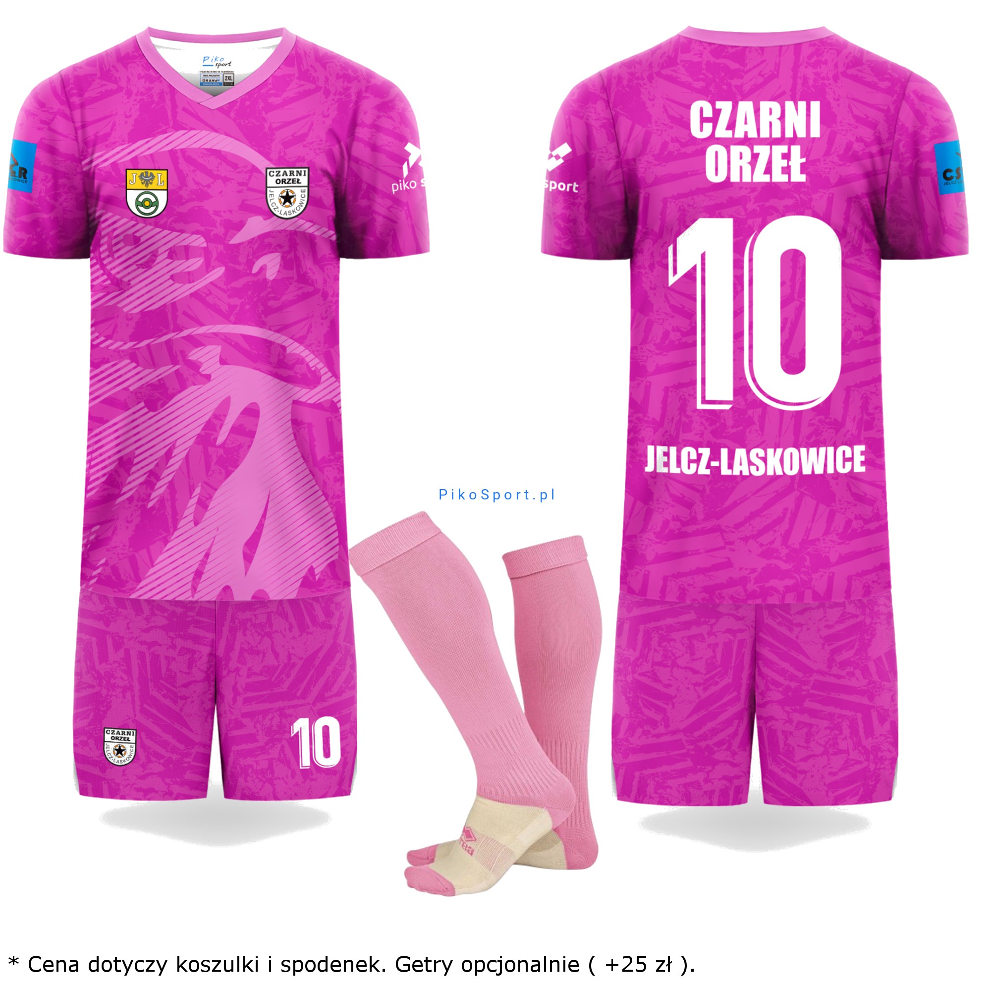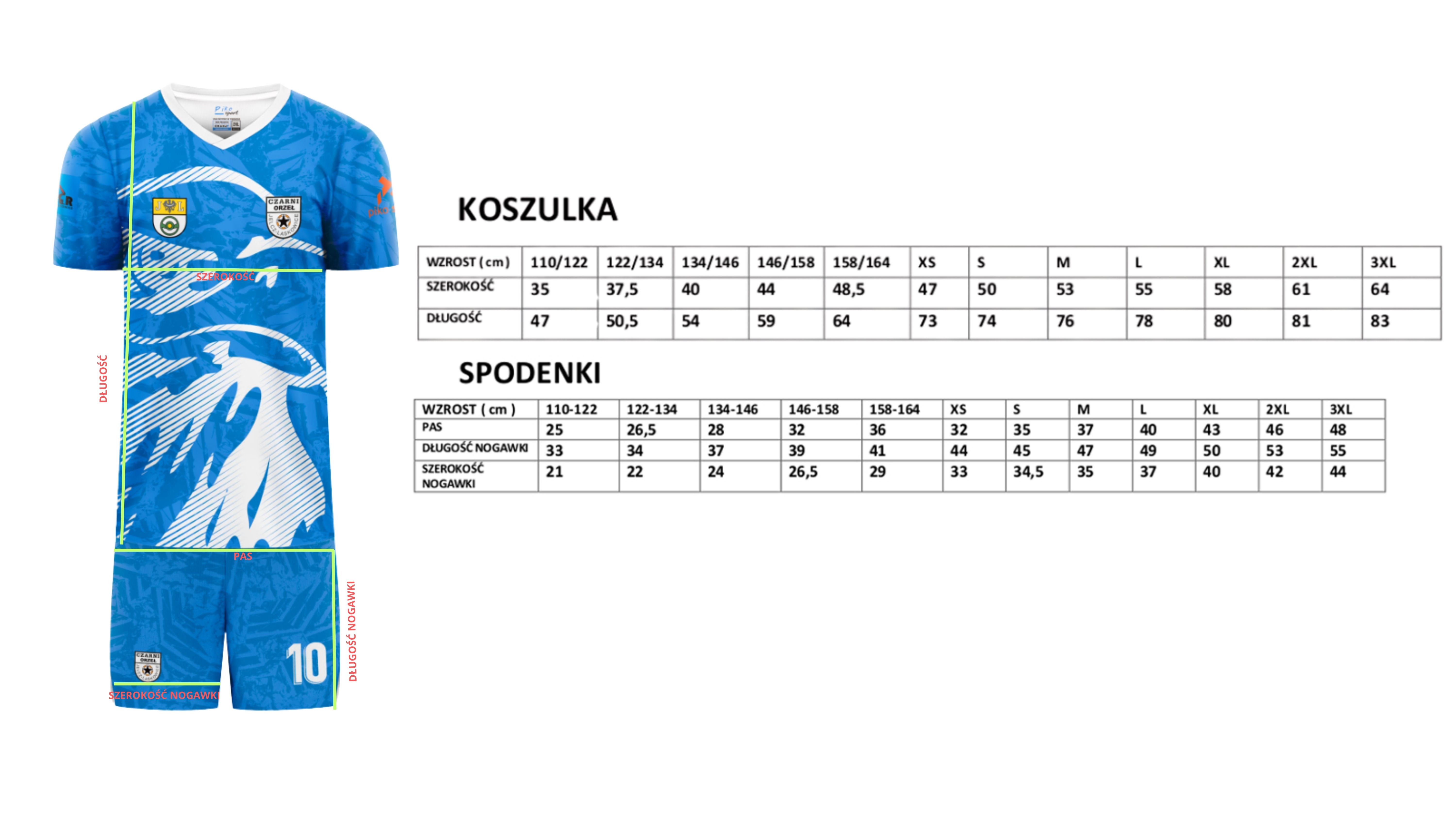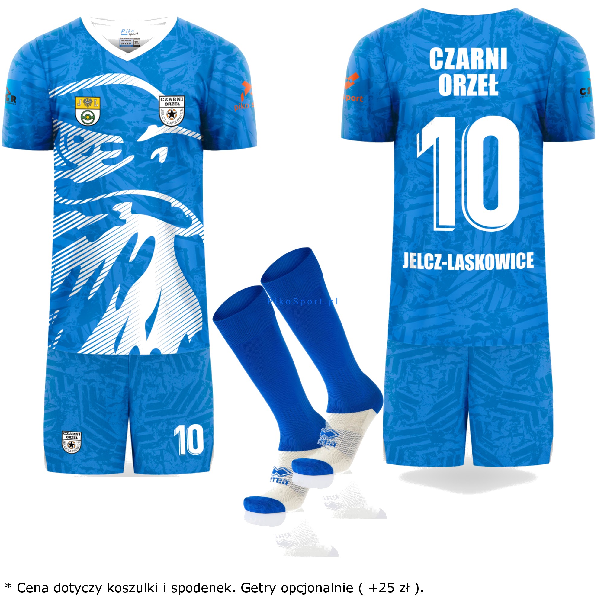 Komplet bramkarski Czarni Orzeł to zestaw składający się z koszulki, spodenek oraz getrów. Posiada unikalną klubową grafikę, która wyróżnia zawodnika na boisku. Nadruki na stroju zostały wykonane metodą sublimacji, która oprócz walorów wizualnych jest również odporna na wszelkiego rodzaju uszkodzenia, ponieważ stanowi integralną część materiału. Strój charakteryzuje się typowo piłkarskim krojem, który doskonale dopasowuje się do sylwetki piłkarza. Materiał, z którego został uszyty to lekka, szybkoschnąca tkanina, zachowująca swoja właściwości po długotrwałym użytkowaniu.