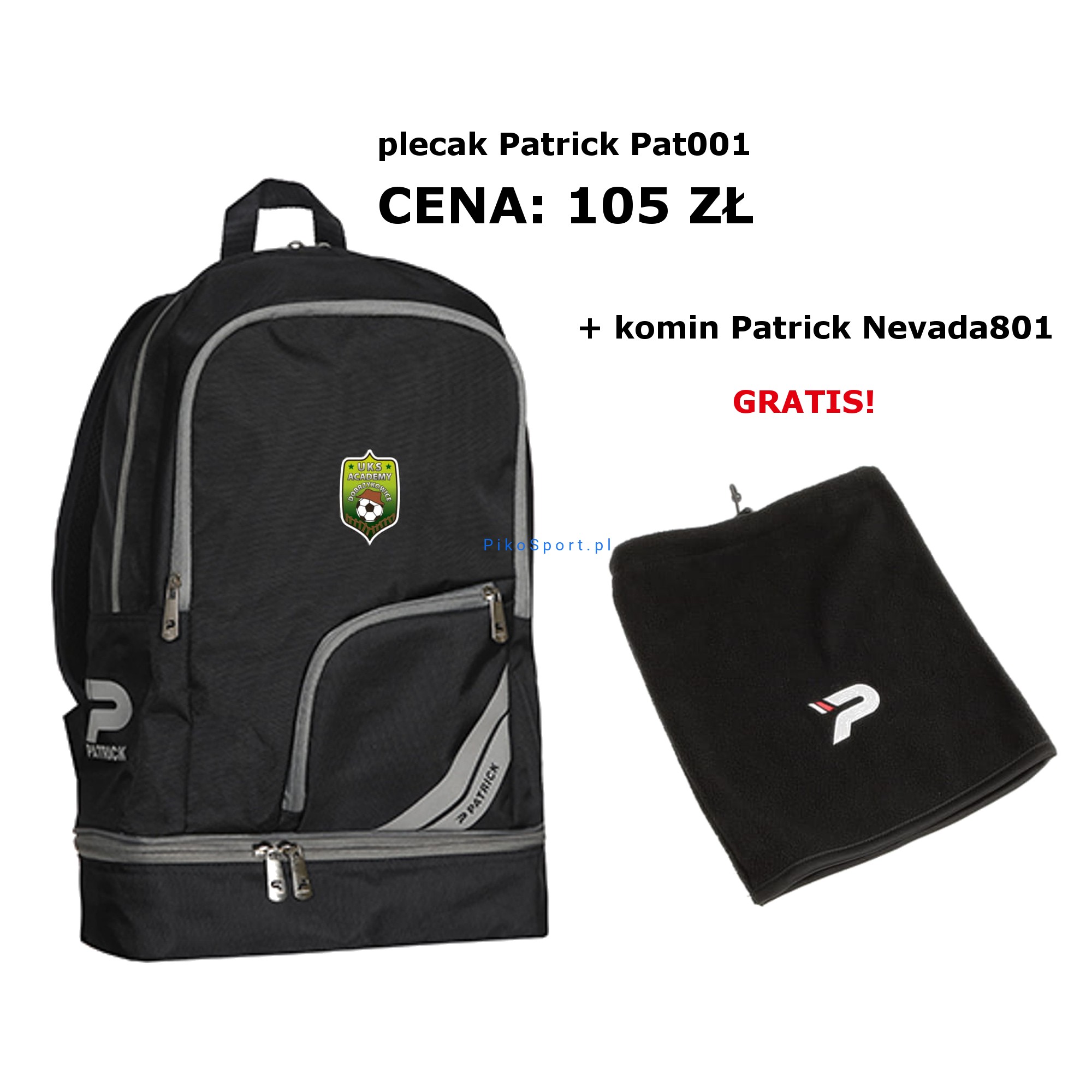 Plecak marki Patrick PAT001 to wysokiej jakości plecak dedykowany zawodnikom Uks Academy Dobrzykowice. Charakteryzuje się dużą funkcjonalnością. Poza główną komorą, został wyposażony w jedną dużą kieszeń zewnętrzną, oraz małą kieszonkę na przechowywanie drobnych przedmiotów. Obie kieszenie są zamykane na zamek. Dodatkowo dno plecaka zostało wyposażone w osobną komorę, służącą np. na schowanie butów. PAT001 doskonale nadaje się na treningi, mieszcząc wszelką niezbędną odzież i akcesoria. Spełni swoją rolę również podczas wycieczek, ze względu na swoją lekkość i optymalną pojemność.